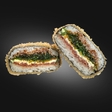 Норі, рис, крем-сир, тунець, салат хіяше, темпура, сухарі панко, соус унагі, мигдальні пластівці