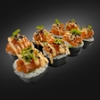Рис, норі, крем сир, огірок, маринована редька, мікс салату, мікс Лосось, соус спайс, кунжут, цибуля зелена